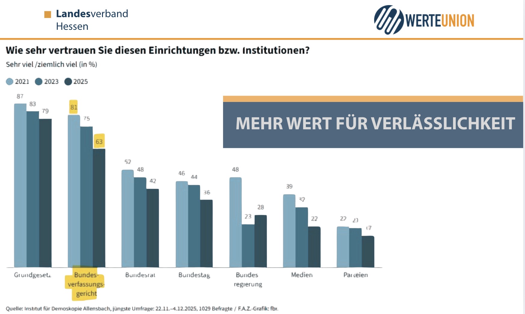 Die jüngsten Umfrageergebnisse des Instituts Allensbach zeigen: Immer mehr Bürger zweifeln daran, dass der Staat noch verlässlich innerhalb klarer Regeln handelt. Das betrifft nicht nur Berlin, sonder besonders auch in Hessen, einem Land mit starkem Mittelstand, hoher Eigentumsquote und ausgeprägtem Verantwortungsbewusstsein, wird diese Entwicklung aufmerksam registriert.